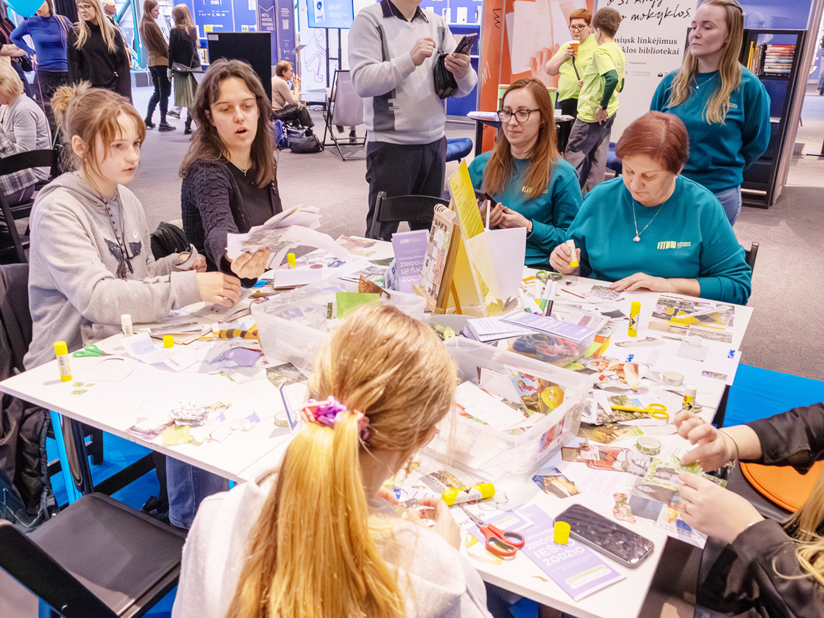 Pirmoji mugės diena tradiciškai buvo skirta bibliotekoms. Toliau galima pasakoti pasitelkus tautosakinius motyvus: ir mes ten buvome, naujausias knygas vartėme, su kolegom ir autoriais bendravome, gera nuotaika dalinomės, o nuo 15 valandos bibliotekoms skirtoje erdvėje dar ir savo kūrybines dirbtuves „Žmogus ieško žodžio“ vykdėme. Šiais metais visus norinčius kvietėme išbandyti koliažo techniką ir panaudojant senų bilietų, pirkinių kvitų, laikraščių, atvirukų, žurnalų ir kitokias iškarpas pasigaminti vaizdingą mugėje patirtų įspūdžių, norų ir svajonių dienoraštį. Nes net ir didžiausių švenčių šurmulys nutyla, o prisiminimai lieka amžiams. Galime pasigirti, kad norinčių pasigaminti kažką gražaus prisiminimui tikrai nestigo.
