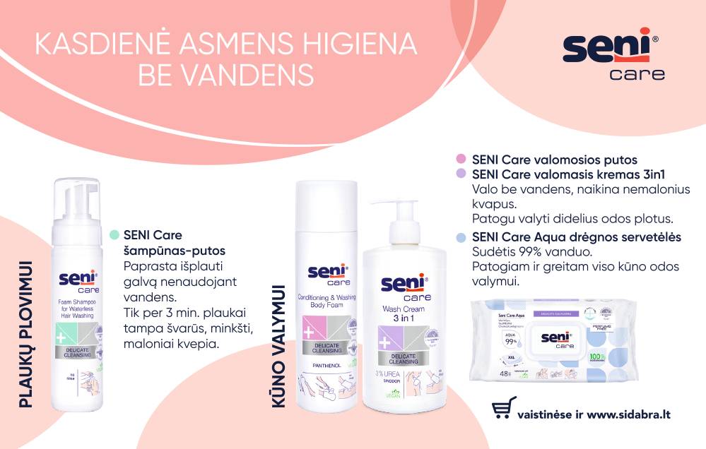 Būtent tokioms situacijoms sukurta „SENI Care“ slaugos kosmetika. Kūną prausti galima SENI Care“ valomuoju kremu arba SENI Care“ valomosiomis putomis, kurios švelniai nuvalo odą, nepažeidžia jos apsauginio sluoksnio ir jų nereikia nuplauti. Tai labai palengvina kasdienę kūno prausimo rutiną, ypač slaugant gulintį pacientą.