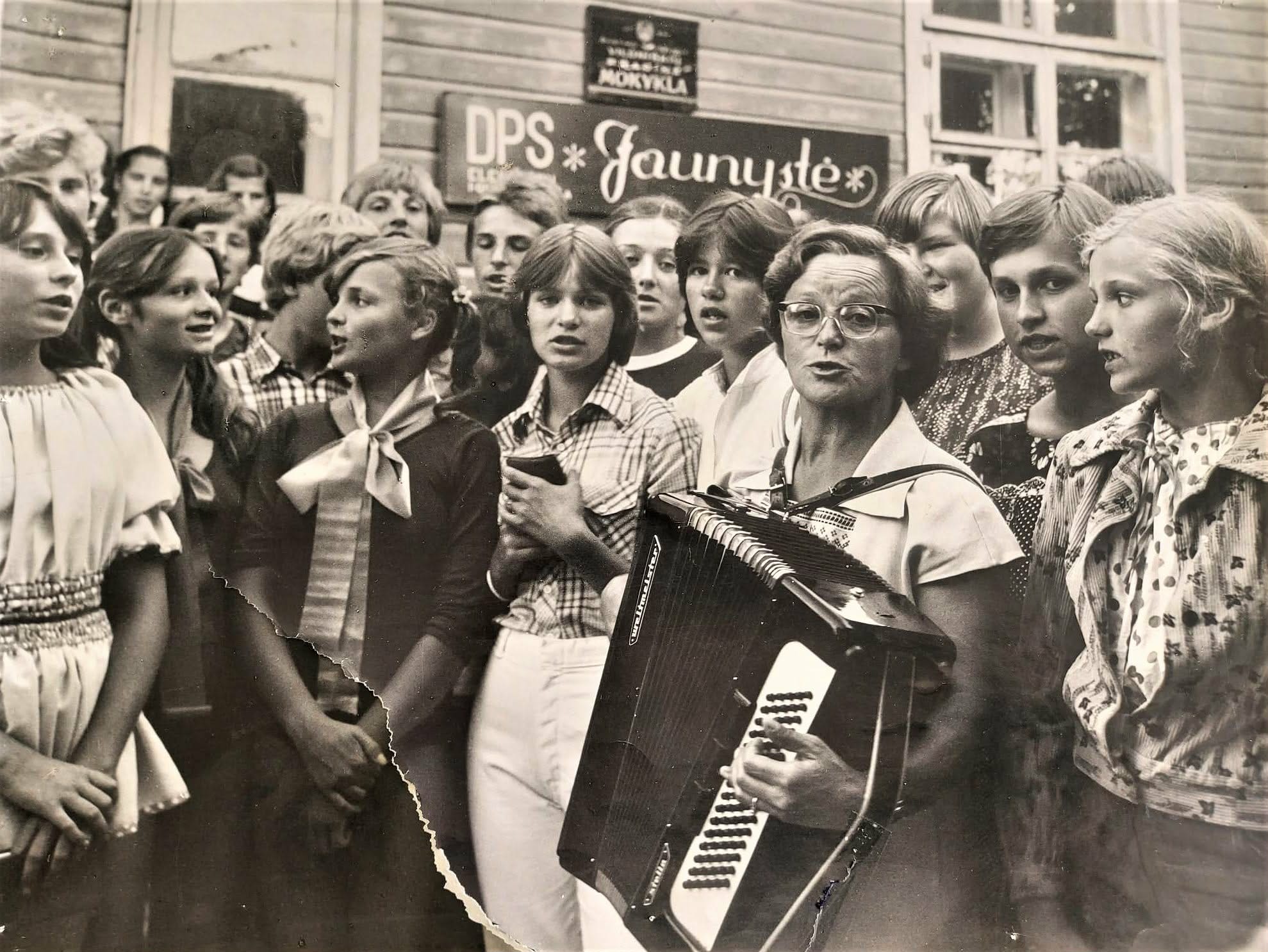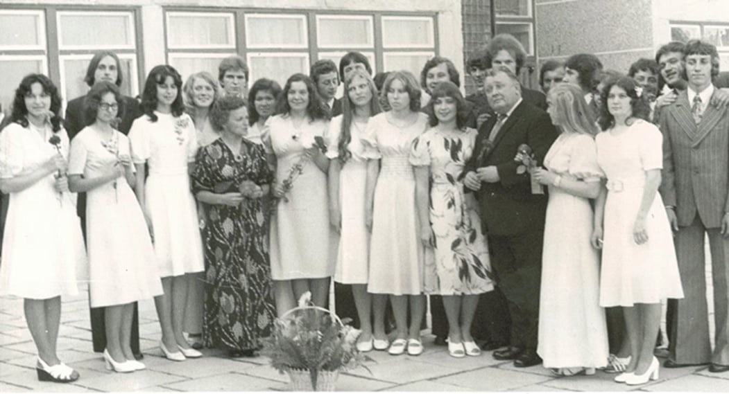 S. Šarakojytės pirmoji laida ir pirmieji abiturientai 1975 metais atidarytoje (dabar „Ąžuolyno“) mokykloje